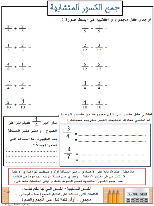 أوراق عمل العمليات على الكسور للصف الرابع الفصل الثاني 2018 2019